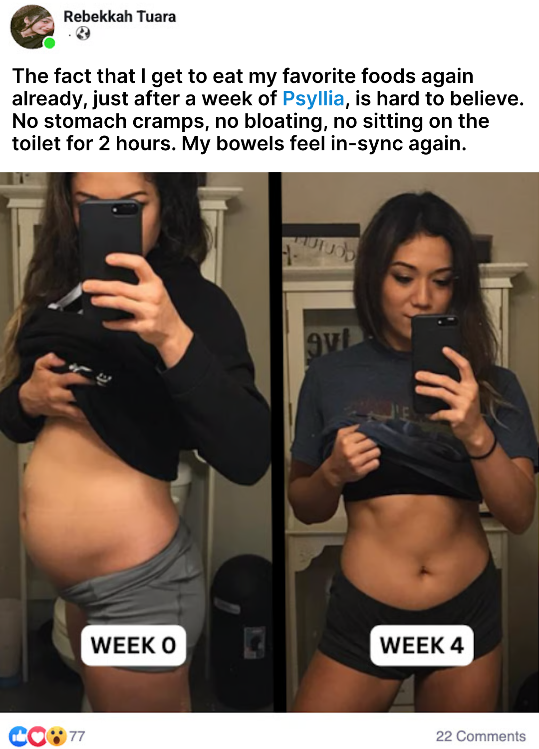 "I used to feel so heavy and sluggish after even the smallest meal. I’d push through workouts, but my stomach always felt puffy and uncomfortable. With Psyllia, I finally feel light and in control again. My digestion feels calm and I don’t get that post-meal crash."